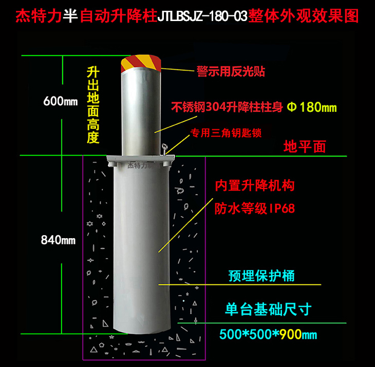 3、警示方式:升降柱的表面有50mm的反光識(shí)別帶作為警示,能夠被過(guò)往車(chē)輛的駕駛員明顯識(shí)別。